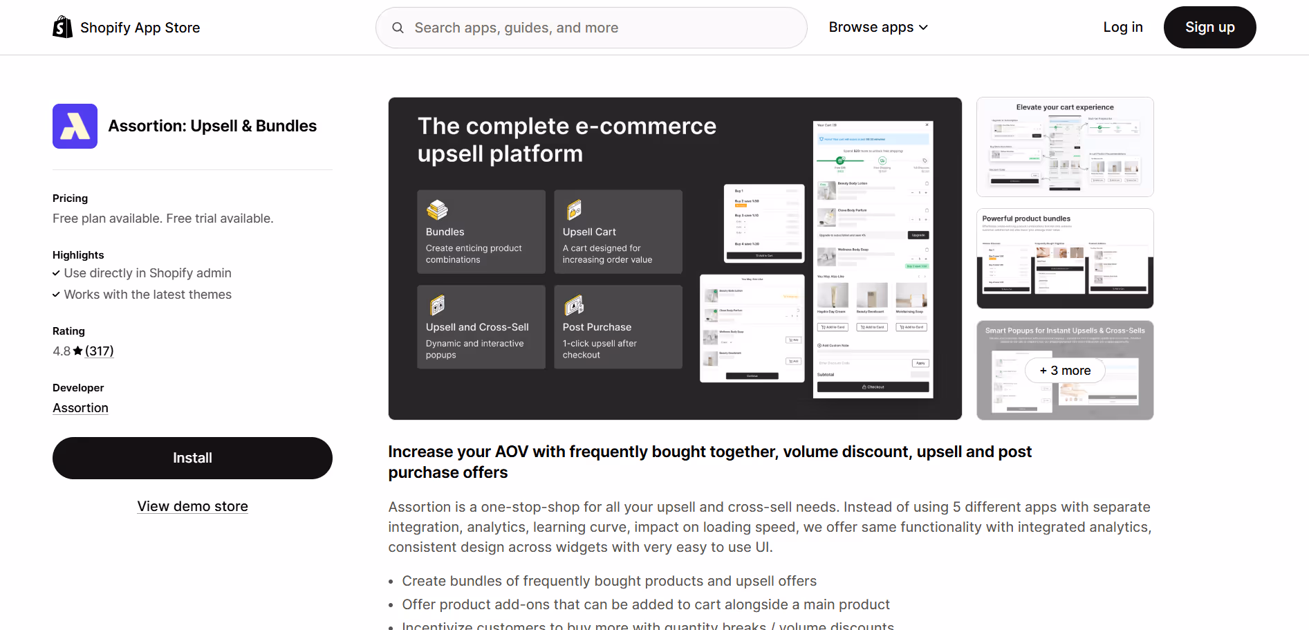 Assortion is a great alternative for stores looking to combine bundle creation with upsells and cross-sells. It supports inventory syncing, flexible bundle logic, and works well with Shopify themes.